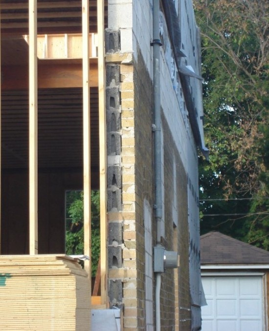 Cross Section of what a 1950′s ‘Block and Brick’ wall looks like in East York. Though its true that ‘block and brick’ houses are more air tight than older ‘double brick’ homes, the walls minimum air leakage won’t come close to 0.02 litres of air per second per meter square as specified in the OBC (9.25.3.2(1)).