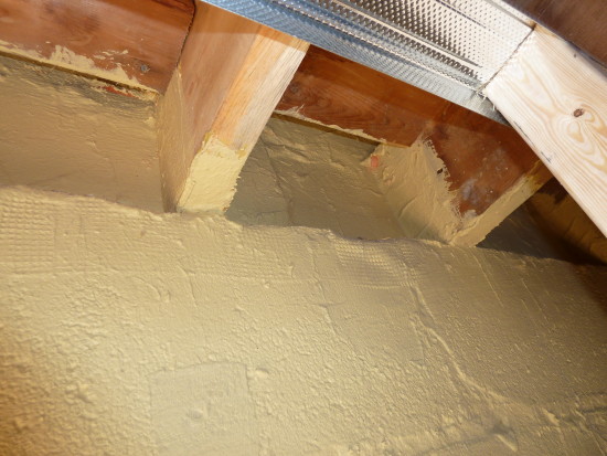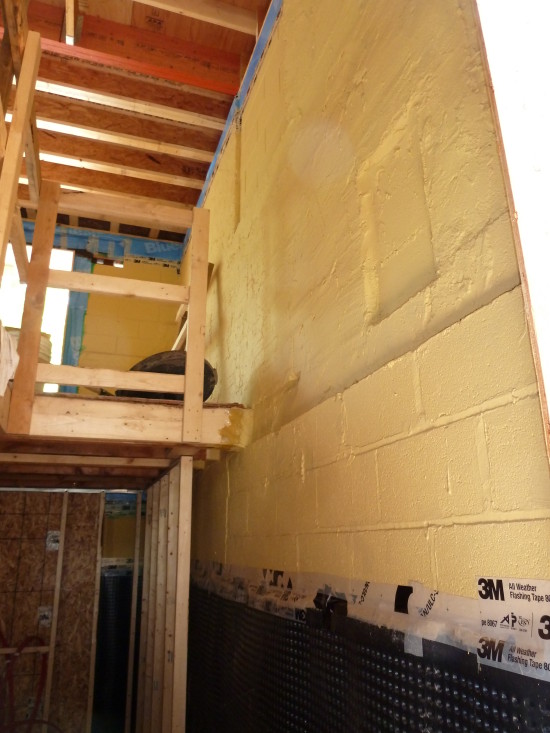 I happen by Greening Homes’ DER of a East York bungalow today off O’Connor and was gob smacked by what I saw; Yellow Gold. That’s right, liquid yellow gold applied to the inside face of masonry. Steven Gray, the Site Super told me “To bridge larger cracks, Sto has another product “Sto Gold Fill” which has the consistency of drywall compound and is used in conjunction with a mesh tape. We removed the existing sheathing and perimeter blocking to be able to access the joist ends – that’s how committed we are to a tight envelope!”