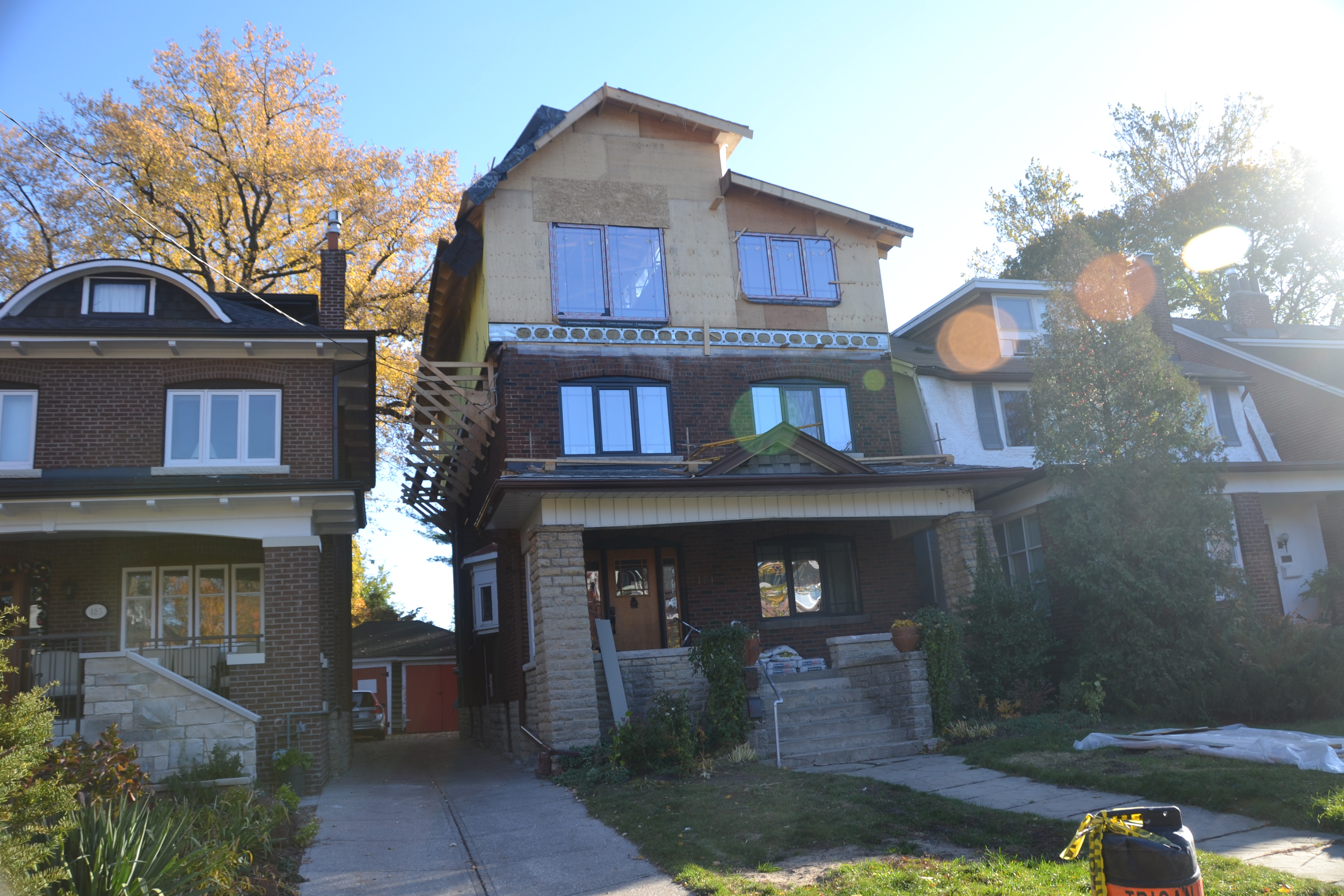 This 100 year old Toronto home gets a nice 3rd floor addition, but the small overhanging floor detail on driveway side is prone to air leakage and insulation detailing weakness, but so too is the choice of steel for the floor joists.