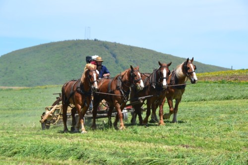 The Effort and Ingenuity part: Amish raking a field of hay with renewable carbon… except for that 5HP Briggs & Stratton behind the farmer’s head. That was for hydraulics to raise and lower the apparatus.