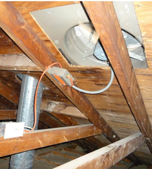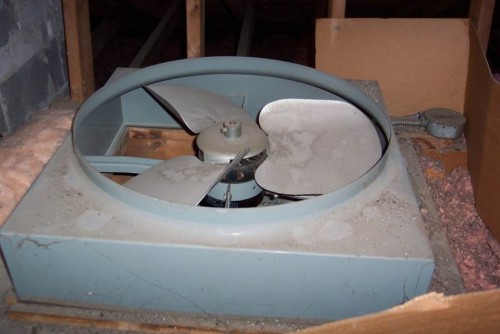 Whole-house exhaust fans are a different story. They were more common in the 60’s and 70’s and the concept was, on a hot summer rainy night with a house full of smoking sweaty guests, a large fan connecting the living space to the attic could be turned on and with all the windows in the house open a large fan like this could bring a great deal of comfort to guests.