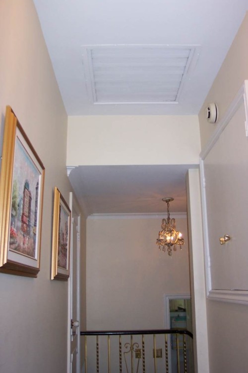 Seen form below in the central hall of a 1950′s home, this whole house exhaust fan can move lots of air when its on or off.