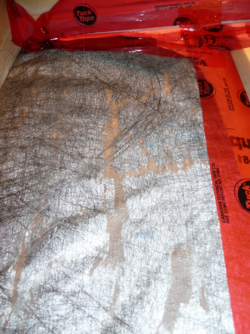 The second problem, and this is a common issue is that Typar has to be installed label to the exterior and the Tuck Tape only sticks to the labeled surface, not the fuzzy back. Many of these seams were leaking air.