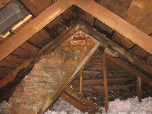 This photo was passed to me by Don Noble and it shows proper corbelling of masonry units to get the chimney centred on the ridge of the roof, heaven forbid, not on the side.