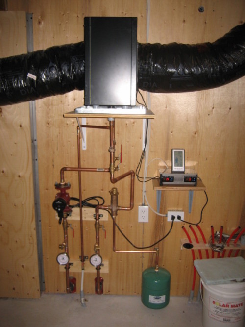 With a few turns of 3/4″ pex buried outside the foundation wall at footing level, he connected the loop to a in-line radiator with the incoming fresh air and filled the loop with glycol.The loop gather’s the ground’s heat and imparts it on the incoming cold air warming it significantly.