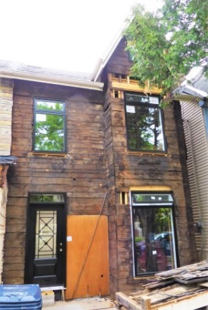 This 1890’s Victorian-era home in Toronto is being renovated and the early signs don’t look good. The dimensional lumber sheathing is exposed after 120 years and what an historic and great opportunity to install an air barrier and continuous insulation on the outside to go with those nifty black framed windows.