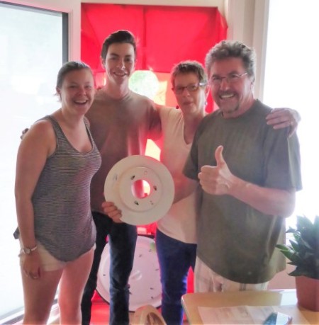 The proud home owners, Mr. Waters holds the the TEC ‘D’ ring posing for a picture in front of the blower door. Good work on the air sealing!