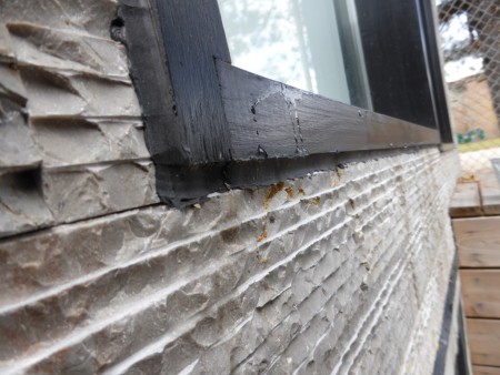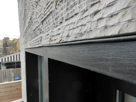 The top of this window frame had no protection from the minimalist head flashing; its edge was hemmed, it only horizontally overhung the window frame below it by 2mm and had no vertical lip protecting the frame below it. The water coming off the wall would likely curl around and sit on top of the wood window frame.