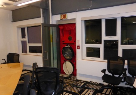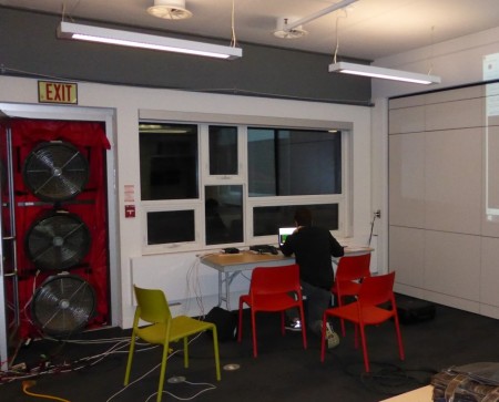 We set up the control centre and 3 fans in the door way of Meeting Room 2. We were projecting the results live from TECLOG on the screen with one computer collecting data from each fan and manometer while also controlling the fan speed. Results were good with an R square of 1.000 for each the pressurisation and depressurisation tests.