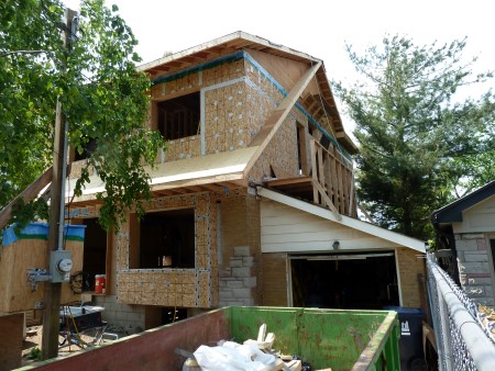 The build in progress where the solid block and brick masonry corner can still be seen in this earlier photo. The main floor was insulated on both sides of the old wall with Isocyanurate on the outside.