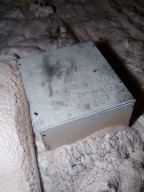This pot light in an attic floor was boxed with drywall then spray foamed with two pound foam. Nice work – but a lot of work.