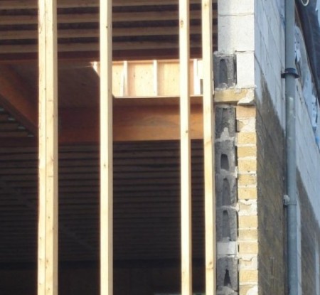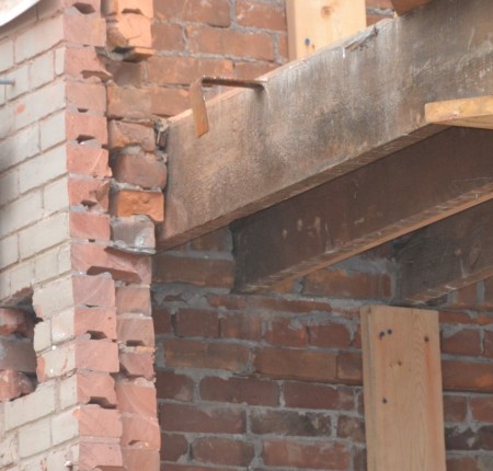 This 1940′s block (grey cinder block) and brick (yellow) shows a new full width concrete block being laid on top of the old wall for a new second story. Note that between the wythes there’s no drainage cavity and no room of insulation.