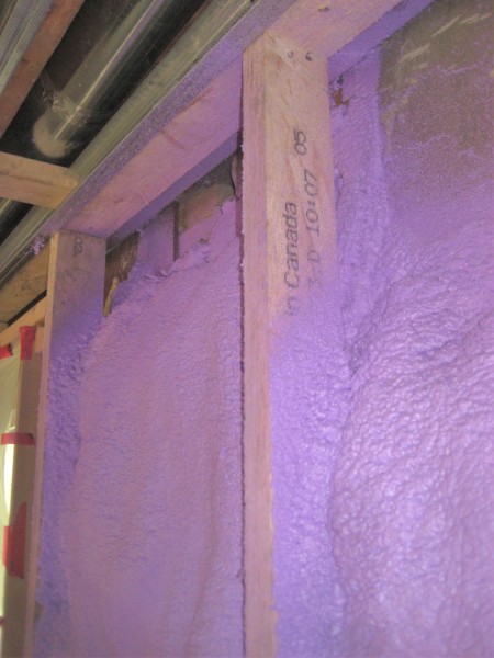 In this photo, we can see that the new wall studs were spaced far off the wall so that a monolithic layer of spray foam could be applied to the inside face of the block wall. This layer helps ensure that wood elements don’t penetrate the air barrier (foam) and cause air leakage, and the layer also reduces thermal bridging at the framing members. Air tightness test spray foam every time, we find many air leaks in foam and because the air gap between the face of the foam and the back of the drywall, the air leaks are very noticeable.