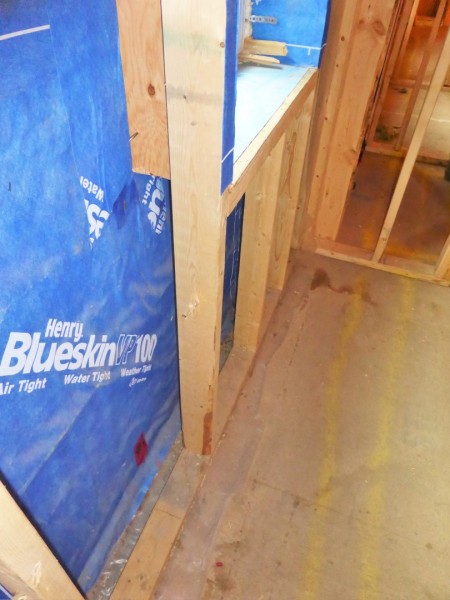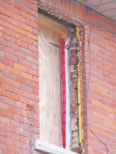 This double brick house had the interior face of brick exposed, primed and Self Adhered Membrane (SAM) installed. See below for close up. Roll this stuff to ensure it sticks well.