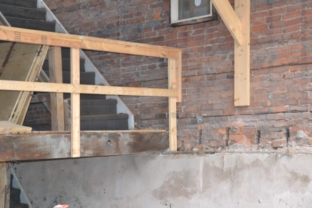 Photo 2: This picture of a house being gutted corresponds to the image above but on the inside. This is what the partywall (shared or warm) wall looks like with wood floor joists “embedded” into the wall.