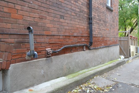 Photo 1: Typical Toronto double brick: The couloured brick above the foundation wall often spalls at this joint because it gets water from above (if rain pushes through missing mortar) and from below with the foundation wall itself pulling water from the soil or puddling against the foundation.