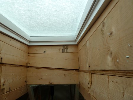 The skylight ‘tube’ from the attic side rarely gets well insulated and to reduce heat loss along its length, best if well insulated and sealed at top against roof line. Note the bottom corner has poly vapour barrier on the outside, on the cold side, this is in Canada – see what I mean by short shrift?