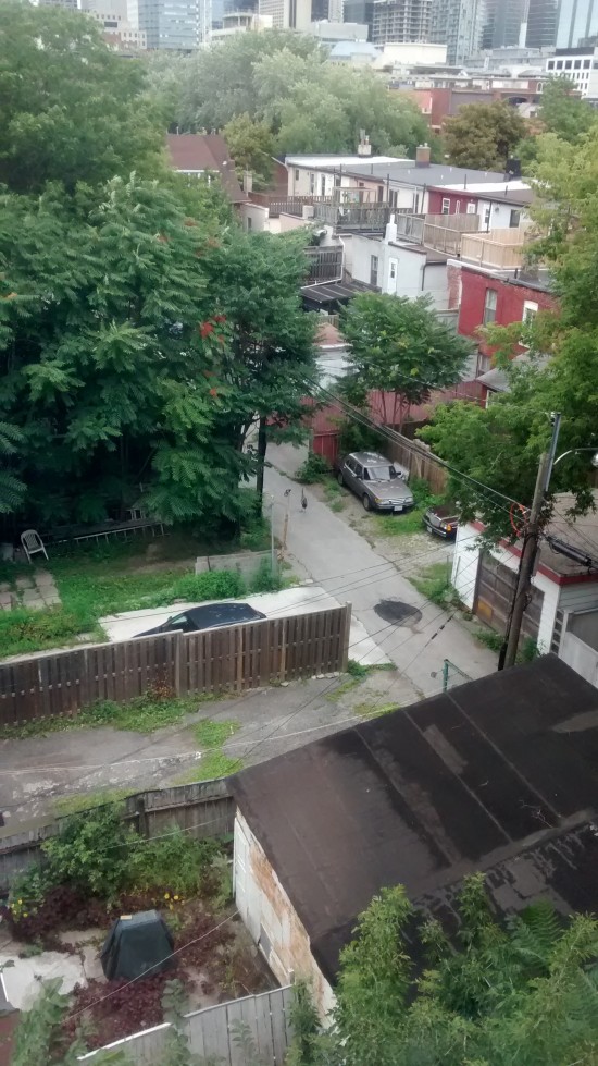Dead centre, the Heron is scoping out the alleyway behind our offices (Robertson Building at 215 Spadina Ave), dated August 14, 2014 2:15PM.