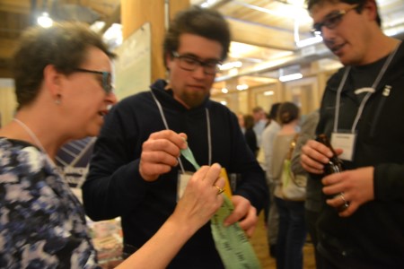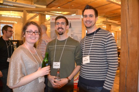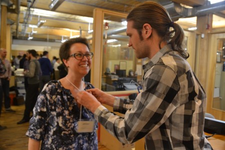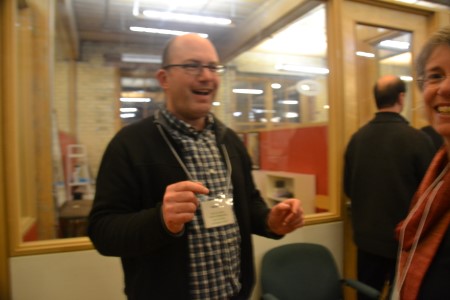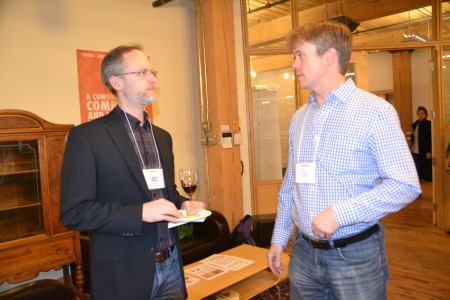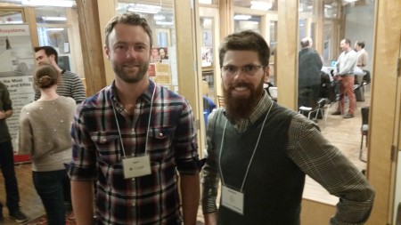 Sponsor Hans Eich of Pinwheel speaks with builder Todd Smith of Dept356.